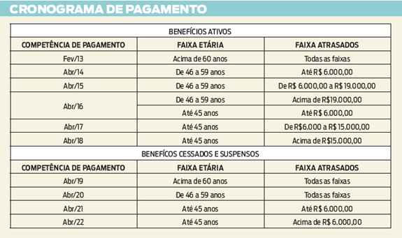 Já para o segurado que teve o benefício cessado, os pagamentos começam em abril de 2019 e contemplam, primeiramente, quem tem idade igual ou acima de 60 anos, sem limite de quantia a receber. Terão o dinheiro depositado por último, só em abril de 2022, segurados com idade até 45 anos e quantias acima de R$ 6 mil.